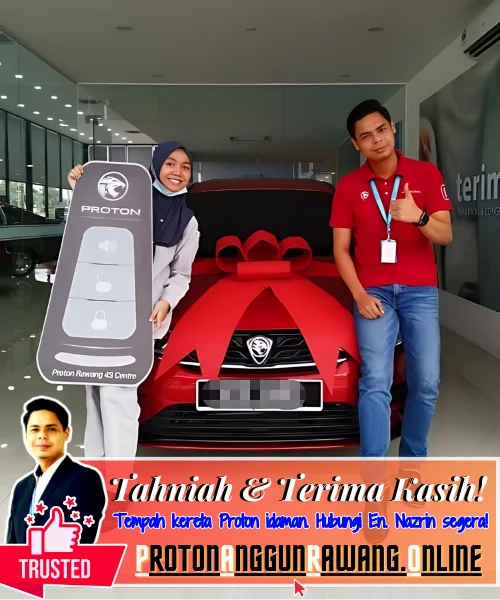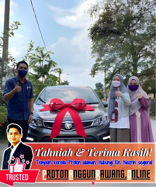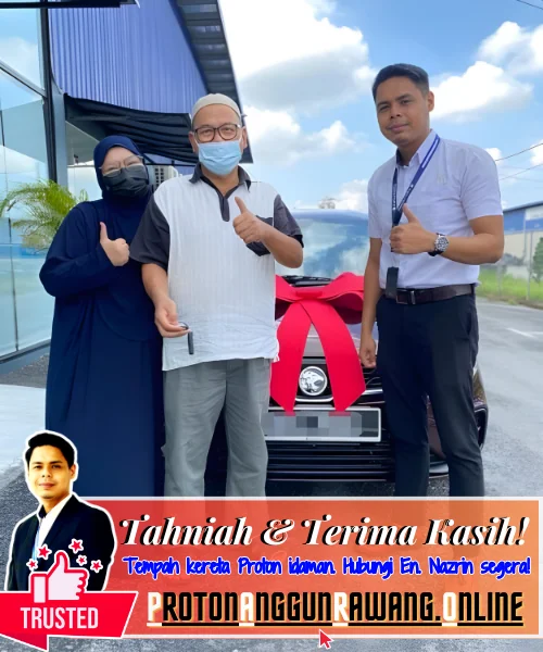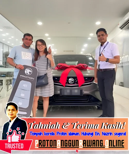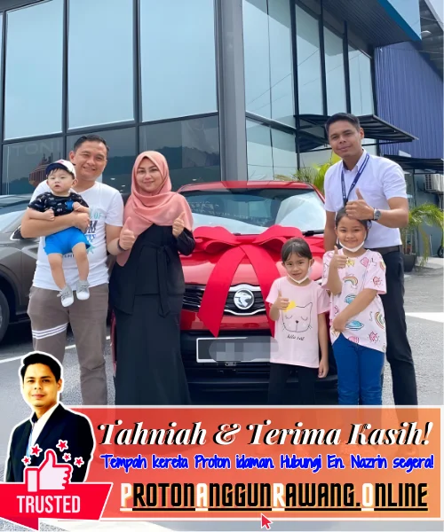 Terima kasih kerana memilih saya sebagai Sales Advisor (SA) yang dipercayai. Saya harap anda semua berpuas hati dengan perkhidmatan yang diberikan. Selamat memandu dengan Kereta Proton serba baharu anda!